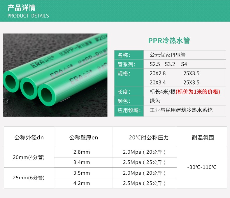 產品介紹:ppr水管作為家裝過程中最隱蔽的工程,將決定未來幾十年家庭用水情況。現在的ppr水管也區分得越來越細致,除了為適應不同場合的ppr水管規格,更有適應水溫的冷熱水管。那ppr冷熱水管有什么區別呢?接下來,將對此進一步說明,希望對廣大用戶在選購水管時能有所幫助。 首先要說的ppr冷熱水管區別便是“壁厚”。雖然ppr水管主要有S4、S5、S3.2、S2.5等規格,看起來外徑似乎是一樣的,但是其壁厚卻有很大的差別。ppr熱水管可以走熱水,當然也是因為ppr熱水管道在相同的外徑下,有著更厚實的內壁,這才足以抵抗高溫對ppr水管造成的傷害。 由于壁厚的問題,進一步我們知曉ppr冷熱水管的第二個區別----“承壓”。ppr冷水管承受壓力的能力肯定要比熱水管來得低,通常來說,ppr冷水管的承受壓力為1.0~1.6兆帕,而ppr熱水管的承受壓力則為1.6~2.0兆帕。